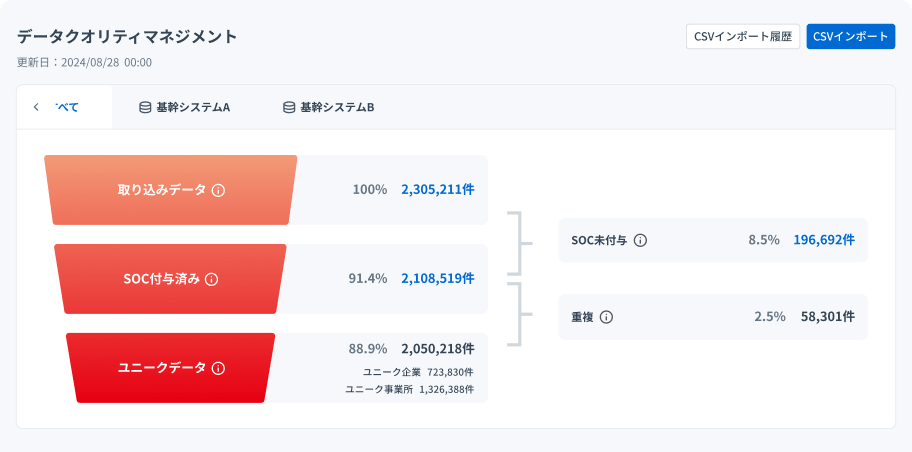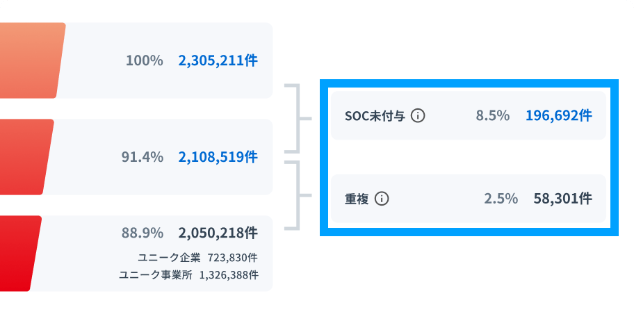 CRMやSFAなどから取引先データを連携すると、企業や事業所が識別され、SOCが付与されます。このコードを活用することで、重複データを簡単に解消できるようになるだけでなく、表記揺れの修正や古い情報の更新、不足している情報の補完も自動で行われるため、クレンジング作業を大幅に効率化できます。部門を越えた複数の社内システムを横断して、最新・正確な取引先データを簡単に維持できます。