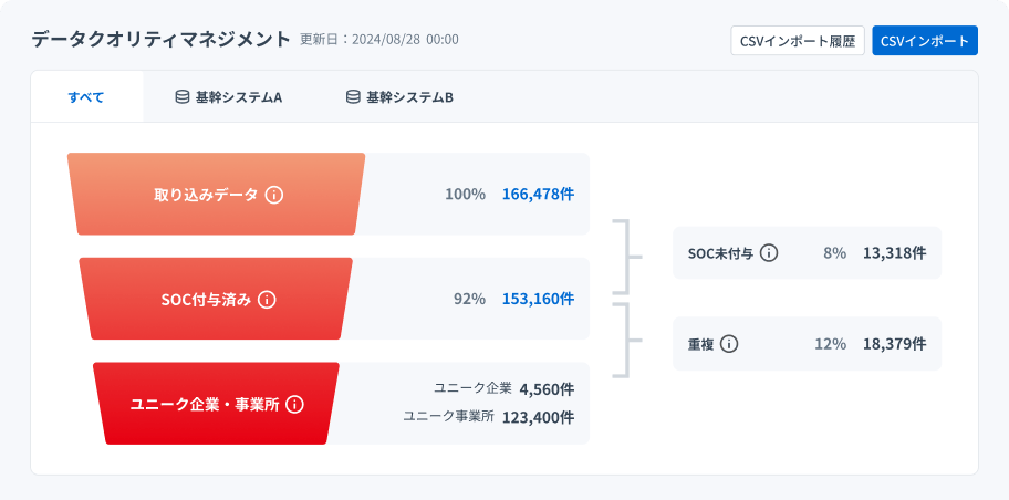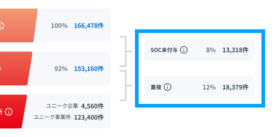 CRMやSFAなどから取引先データを連携すると、企業や事業所が識別され、SOCが付与されます。このコードを活用することで、重複データを簡単に解消できるようになるだけでなく、表記揺れの修正や古い情報の更新、不足している情報の補完も自動で行われるため、クレンジング作業を大幅に効率化できます。部門を越えた複数の社内システムを横断して、最新・正確な取引先データを簡単に維持できます。