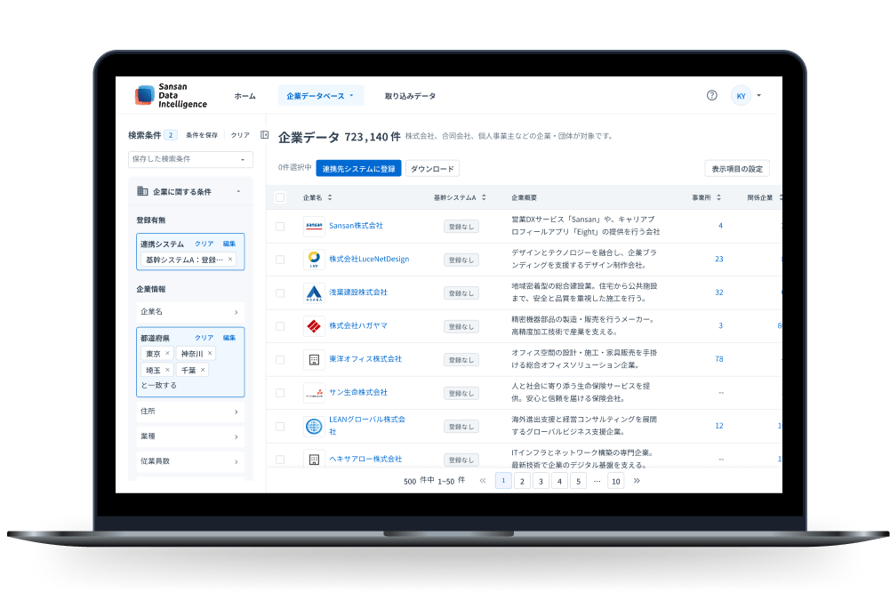 800万件を超える企業・事業所データベースをマスターデータとして、取引先の最新情報を確認できます。グループ企業や事業所の所在地といった情報も瞬時に把握でき、企業理解を深められます。また、2000件を超える独自フラグなどの多様な属性情報を組み合わせて、データベース全体から企業を絞り込むこともできます。取引先として登録されていないデータを検索条件にすることで、ホワイトリストの作成も手軽に行えます。