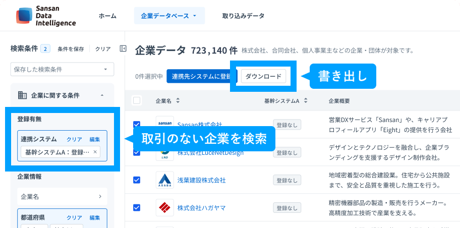 CRMやSFA、オンプレミスのシステムなどで管理されている取引先データを識別し、どの企業や事業所かを特定します。