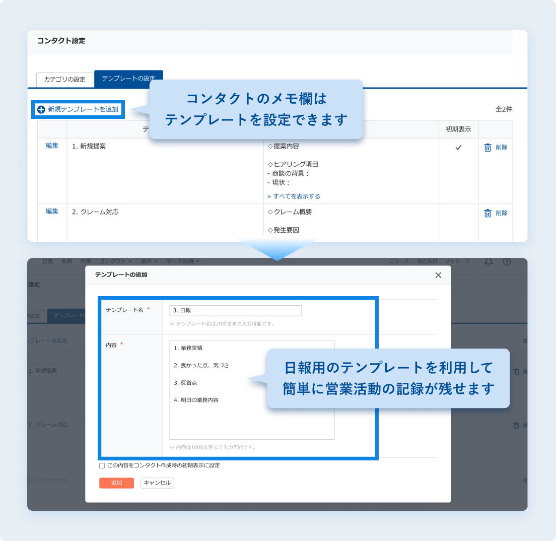 営業担当者が書きやすい日報用のテンプレートをあらかじめ登録できます。入力項目を決めておけば、記述の粒度がそろい、情報の不足を抑えられるだけでなく、簡潔にまとめられるようになります。各営業担当者の活動内容を統一されたフォーマットで把握でき、確認効率が高まります。