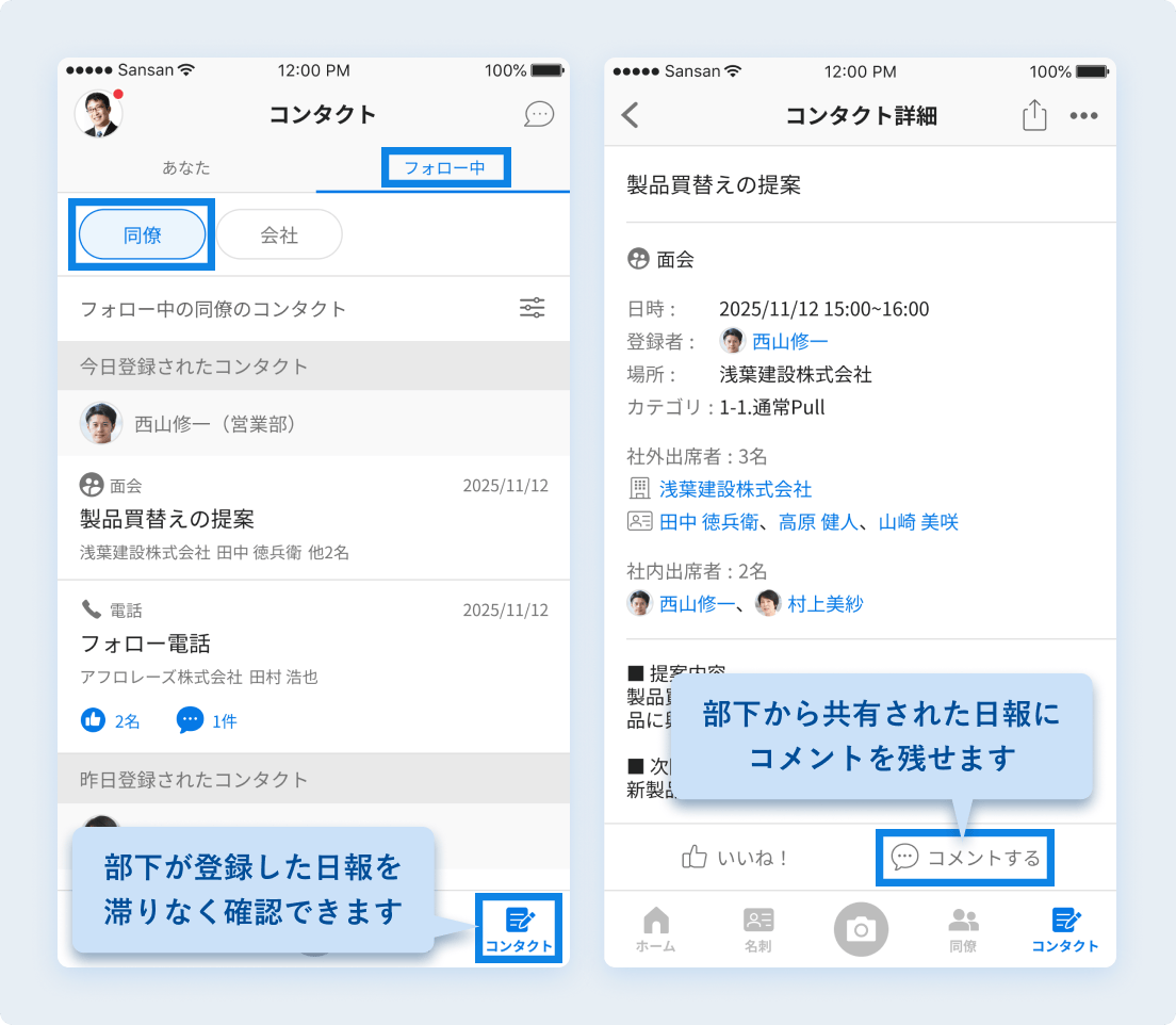 外出先からでも、スマートフォンアプリを使って商談メモを簡単に残せます。部下から共有された日報をスムーズに確認することができ、内容を把握した上で的確なフォローやアドバイスが行えます。口頭報告を待たずにタイムリーなコミュニケーションが可能になります。