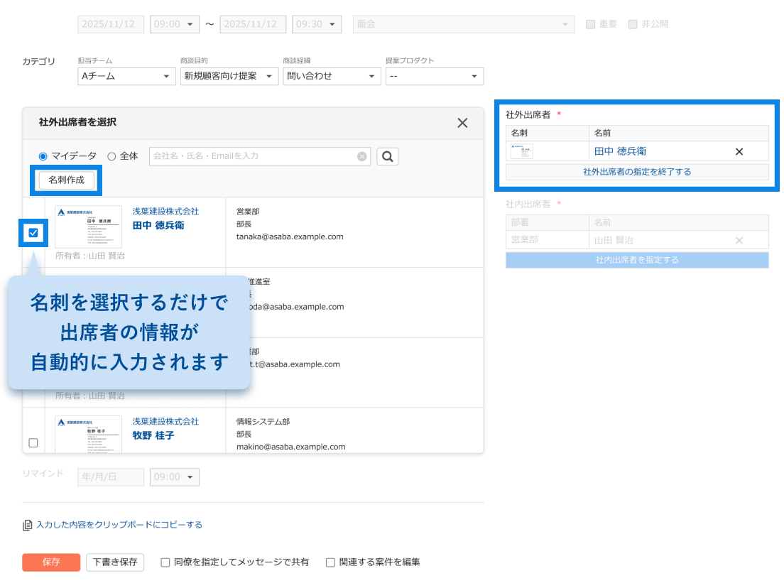 商談メモにSansan上の企業情報や人物情報から出席者を指定できます。手作業で顧客情報を入力する必要がなく、企業・人物に関する情報を正確に記録できます。組織全体で営業活動を共有できるため、個人の業務記録にとどまることなく、日報のより戦略的な活用が進みます。