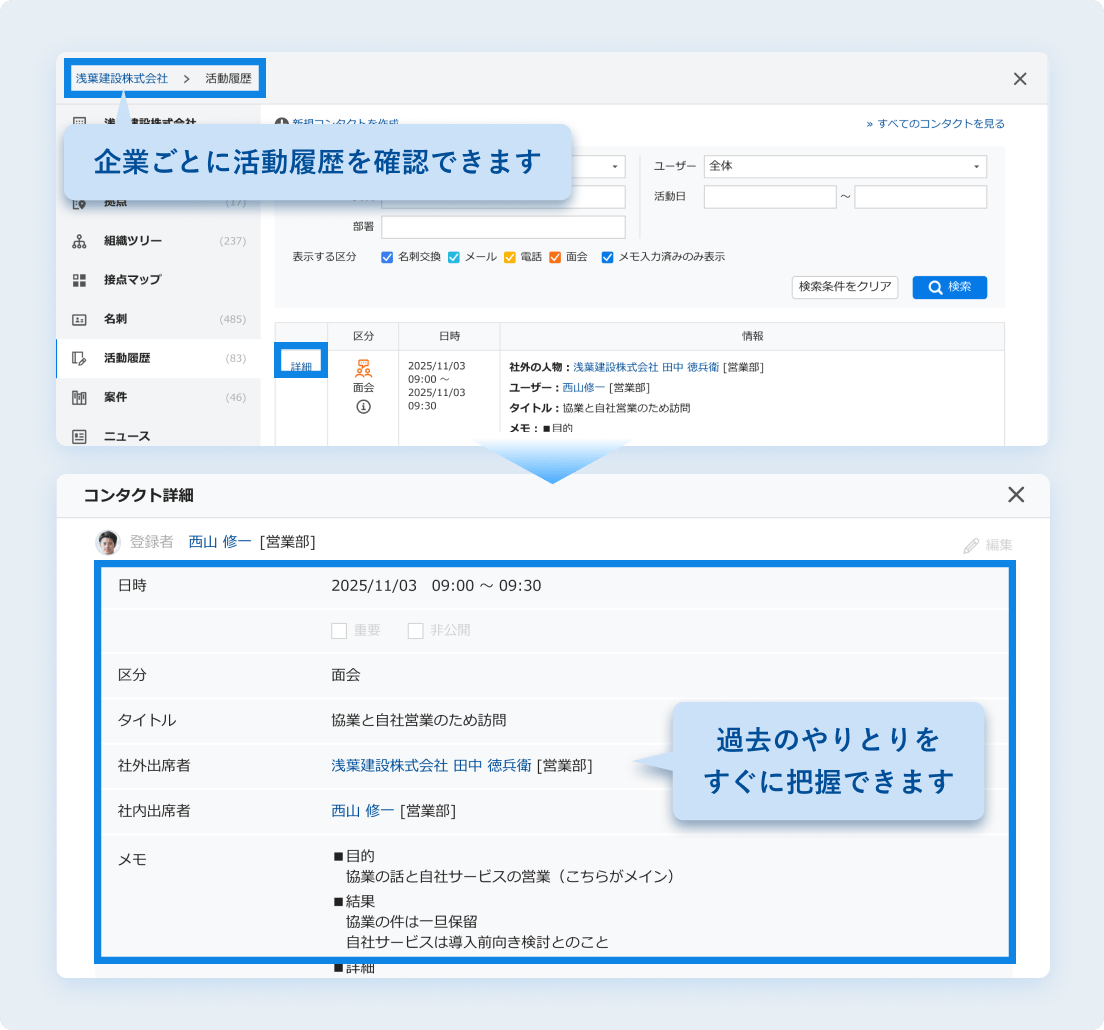 企業情報にひも付けて日報や商談メモを蓄積しておけば、担当変更時に過去のやりとりやキーパーソンの情報をすぐに把握できます。企業ごとに履歴を抽出できるため、引き継ぎ作業も効率的です。新任担当者はこれまでの情報を確認し、関係性を維持するための行動につなげられます。